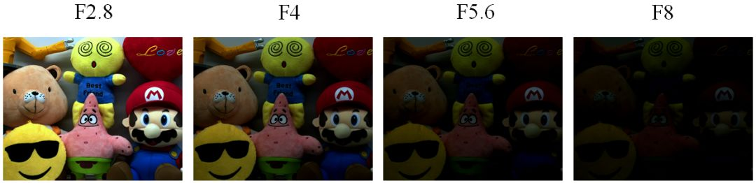 F.No数的大小决定进入光学系统能量的多少。F.No越大,进入光学系统的光线越少,画面越暗;F.No越小,进入光学系统的光线越多,画面越亮。如下图所示:
