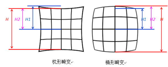 TV畸变可分为枕形畸变和桶形畸变,对角线向外延长的变形(畸变值为正)称作枕形畸变,反之,对角线向内缩短的变形(畸变值为负负)称作桶形畸变。