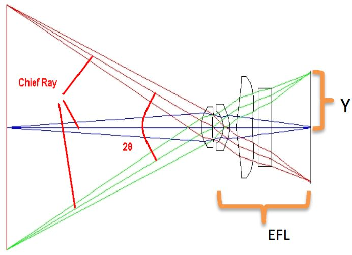 若Y为Sensor的半对角线长度,在不考虑光学系统畸变的前提下,对角线视场角(2θ)=2*arctan(Y/EFL),如下图所示: