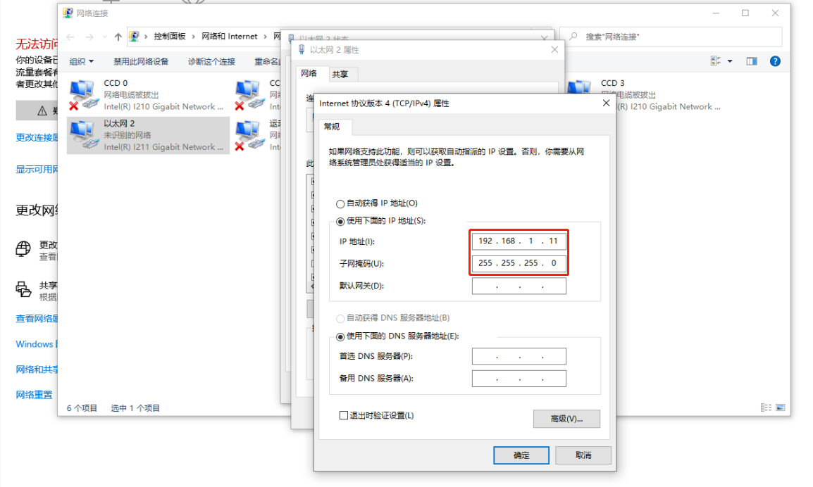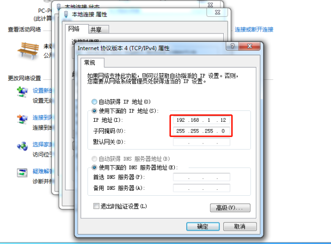 二、 分别将两端的网口IP地址设置成同一网段,子网掩码设置成一致
