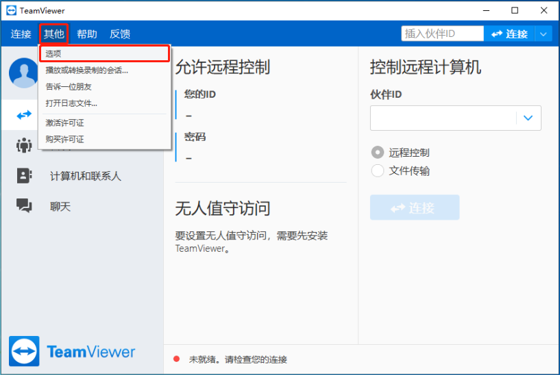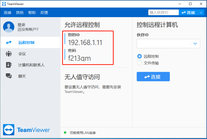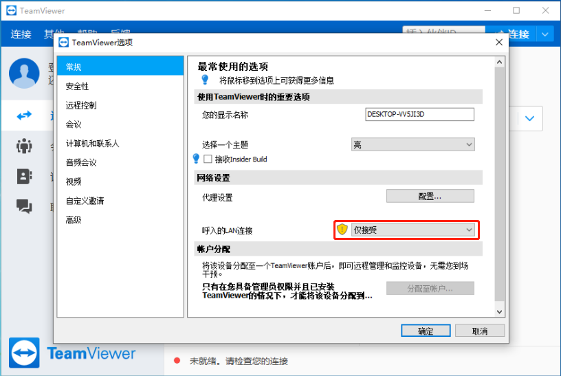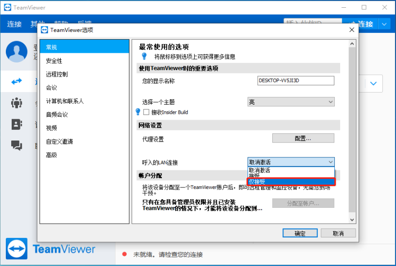 三、 将TeamViewer设置成LAN连接(注意:两端的TeamViewer版本需一致,TeamViewer每次关闭都需重新设置)