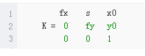 其中,fx,fy为焦距,一般情况下,二者相等,x0、y0为主点坐标(相对于成像平面),s为坐标轴倾斜参数,理想情况下为0