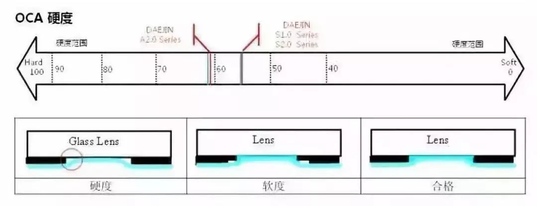 OCA不同的厚度会有一个对应的硬度值,太硬或太软都会影响全贴合的使用,一般的硬度控制值58-65之间。