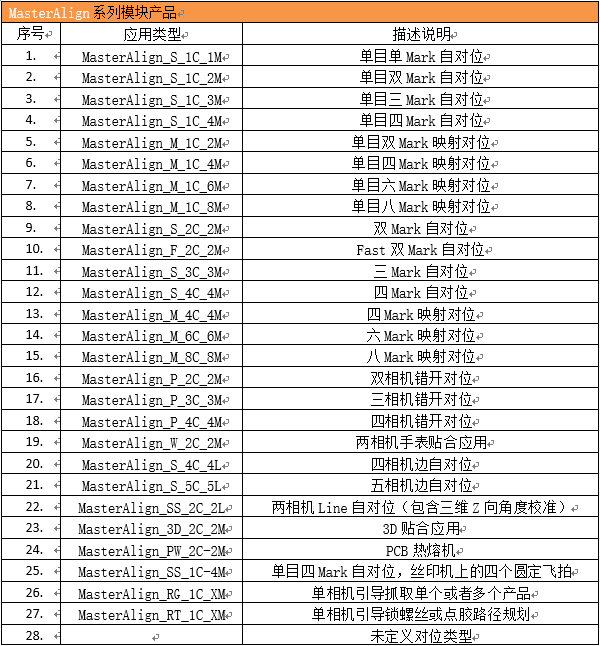 下表为MasterAlign视觉对位软件的详细应用类型说明: