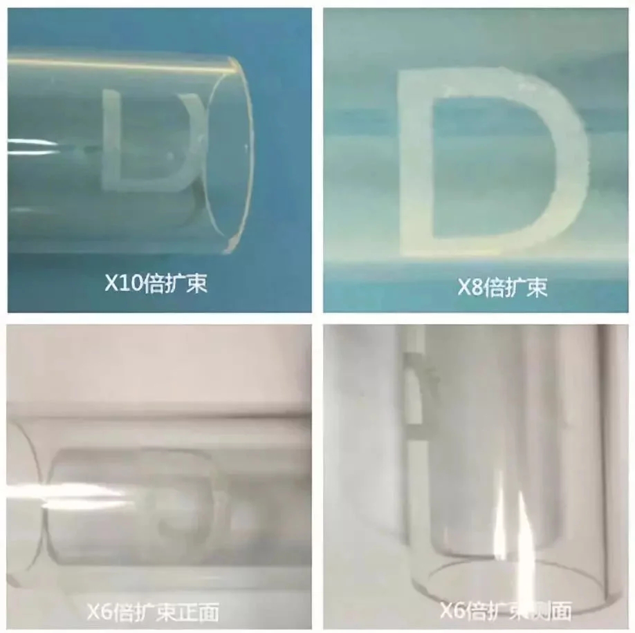 以上图片所示,可以明显的观察到10倍扩束下,能量密度较为集中,表面很细腻,但又因焦深较浅,所以两侧激光没有在表面起作用。8倍扩束下,对于当前曲面的产品,焦深和能量较为合适,打标出来的效果较好。而6倍扩束焦深增加的同时也减小了能量密度,因此漏点很多,效果较差。因此得出结论,对于此类曲面幅度较大,硬度较高的玻璃材料要选用光束质量较好,脉宽较窄的激光器,选用合适的扩束镜或采用3D可变焦振镜来加工此类产品较为合适。