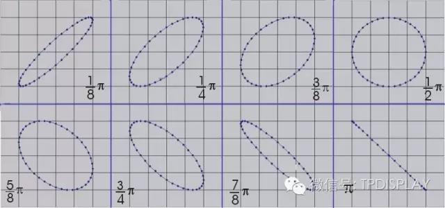 但是,如果O光与E光之间的位相差不是90度,则合成的光就会是不同椭园度的椭园偏振光(或者线偏振光)。下图列出了几种不同位相差时的情况。