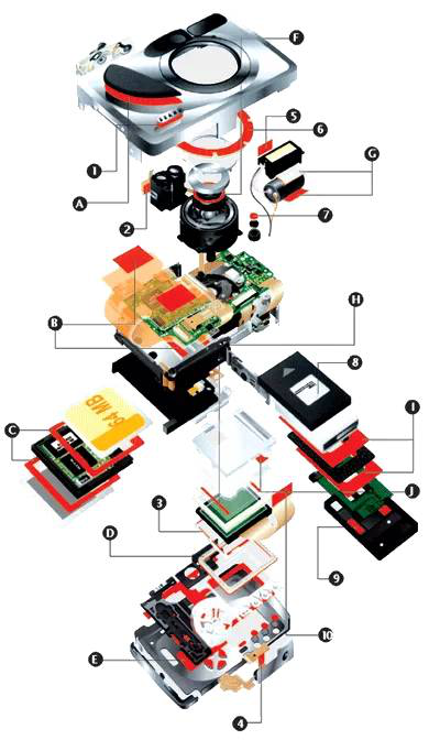 E.按钮及硬质材料的固定 F.镜盖的固定 G.闪光灯电池/缓冲垫的固定