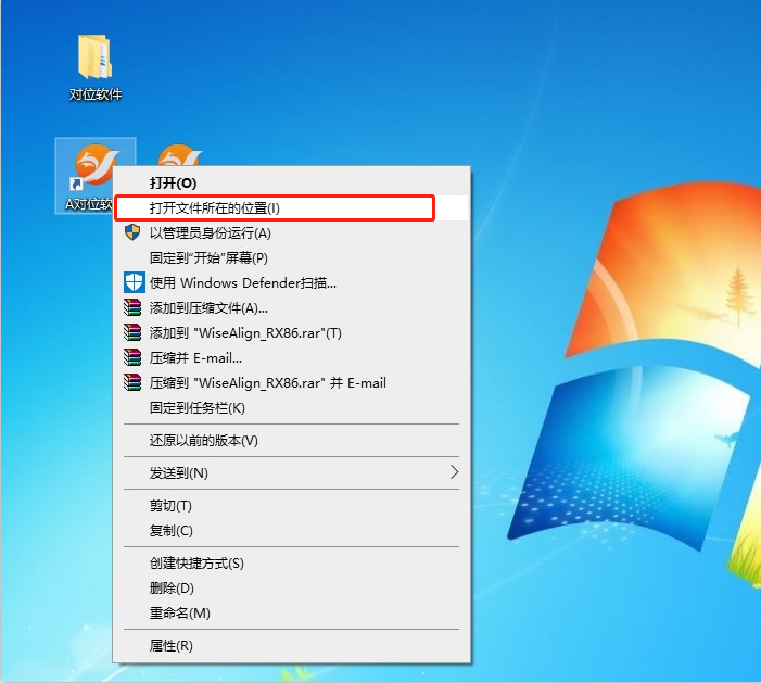 如下图所示,鼠标指着A对位软件,右键,然后点击打开文件夹所在位置。