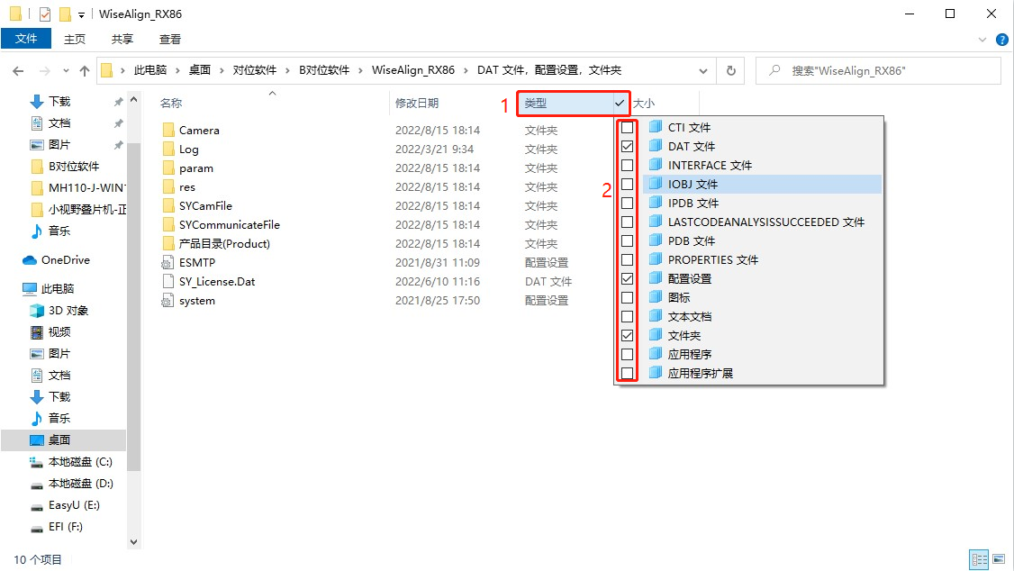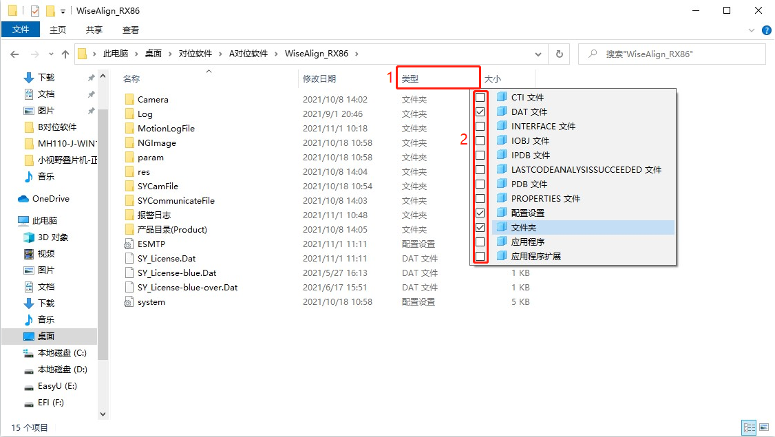 点开A对位软件的文件夹所在位置,然后点击下图当中箭头所指示处后,把2标记处当中的Dat文件、配置设置、文件夹全部打钩,并把当前所保留的文件全部复制到B对位软件的文件夹所在位置上。