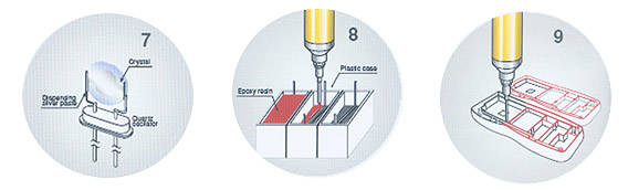 所有的胶水及液体能使用点胶机来做定量点胶,基本上控制点胶量的元素为:固定的针头孔径,固定的压力及相同的点胶时间与移动速度,若能将上述几项参数固定,相信将能轻易达到高稳定性的点胶质量。