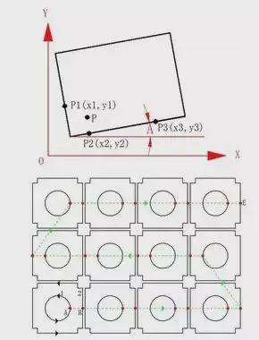启动自动寻边功能后,切割头从P点出发,自动测得板料两垂直边上的3点:P1、P2、P3,并据此自动计算出板料的倾斜角度A,以及板料的原点。