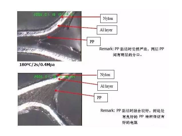 两层PP面相对,通过给予Nylon层一定的热量,热量经Al layer传递给PP,两层pp膜在一定的温度、压力、时间的共同作用下相互融合在一起的过程。