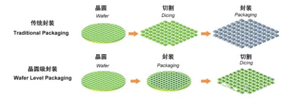 在传统晶圆封装中,是将成品晶圆切割成单个芯片,然后再进行黏合封装。不同于传统封装工艺,晶圆级封装是在芯片还在晶圆上的时候就对芯片进行封装,保护层可以黏接在晶圆的顶部或底部,然后连接电路,再将晶圆切成单个芯片。