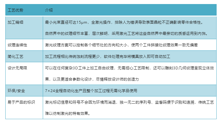 激光纹理效率高、效果好可以被应用在汽车内外饰的很多位置。仪表板、车内音响表面、方向盘、门板、出风口、副仪表板、大灯、尾灯、后视镜等。以及带有触摸功能的智能表面等。