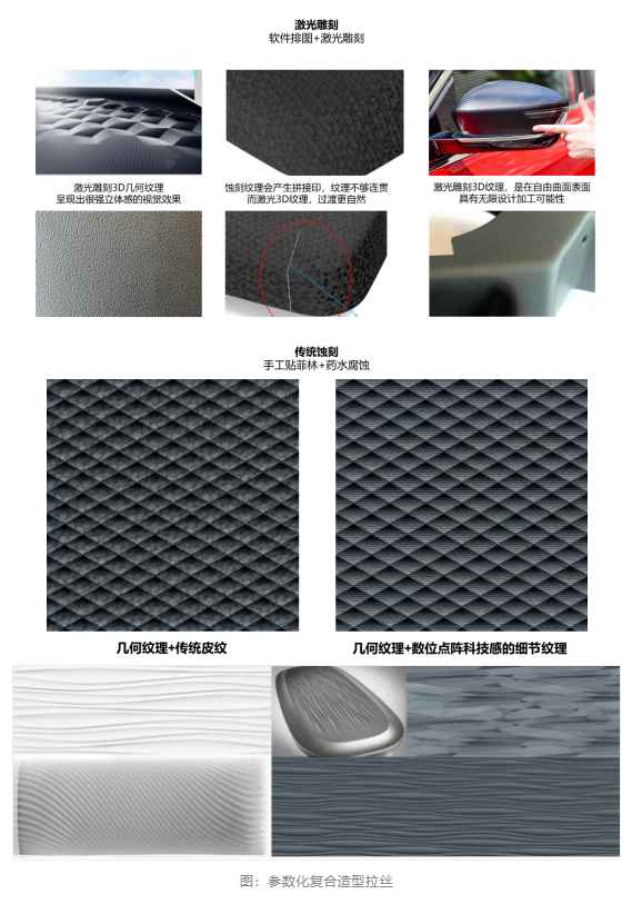 纹理设计开发是细分领域,那汽车举例,纹理部分的设计可能在整车研发部分仅占有较小的部分,但却可以有效提升内外饰感知质量,不同纹理会带来不同的触觉、和视觉感受,实现拉丝、碳纤维、真皮、双缝线、网孔、织布,甚至是体现科技感、未来感、智能化等传统方式无法达到的效果。
