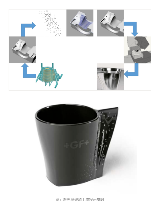 将图纹通过软件渲染到模具的3D文件中,通过软件计算生成加工程序,然后输入到机器,调整好相应参数即可用激光灼烧加工。 将所有表面结构数据转换为灰度位图。然后,用3D动画软件添加这些三维数字图形,确保激光束以最理想的90°角到达目标区域。
