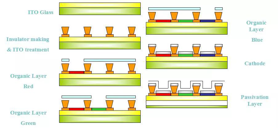 OLED因其构造简单,所以生产流程不像LCD制造程序那样繁复。但由于现今OLED制程设备还在不断改良阶段,并没有统一标准的量产技术,而主动与被动驱动以及全彩化方法的不同都会影响OLED的制程和机组的设计。但是,整个生产过程需要洁净的环境和配套的工艺和设备。改善器件的性能不仅要从构成器件的基础,即材料的化学结构入手,提高材料性能和丰富材料的种类;还要深入了解器件的物理过程和内部的物理机制,有针对性地改进器件的结构以提高器件的性能。两者相辅相成,不断推进OLED技术的发展。