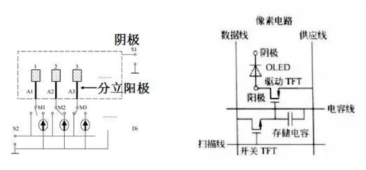 与PMOLED不同,AMOLED是在每一个像素单元布置了2个晶体管及1个电容(即2T1C),这是AMOLED最基本的像素驱动电路方式,考虑到亮度均匀性等性能补偿,也可以设计更多的晶体管和电容。有源驱动的每个像素配备具有开关功能的薄膜晶体管,而且每个像素配备一个电荷存储电容,外围驱动电路和显示阵列整个系统集成在同一玻璃基板上。有源矩阵的驱动电路藏于显示屏内,更易于实现集成度和小型化。另外由于解决了外围驱动电路与屏的连接问题,这在一定程度上提高了成品率和可靠性。有源驱动突出的特点是恒流驱动电路集成在显示屏上,而且每一个发光像素对应其矩阵寻址用薄膜晶体管,驱动发光包含薄膜晶体管、电荷存储电容等。