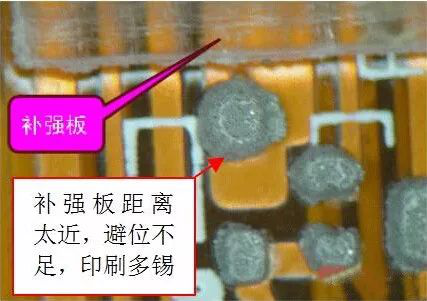 补强板和背胶在设计时需要考虑与焊盘的距离,否则沉槽的避位距离不足,引起印刷多锡、连锡。如下图。