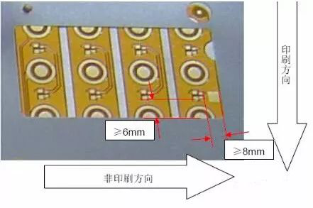 其次,可将压片的开口做大来减少压片厚度的影响,推荐压片开口边缘与焊盘边缘的距离为:印刷方向至少8mm,非印刷方向至少6mm。