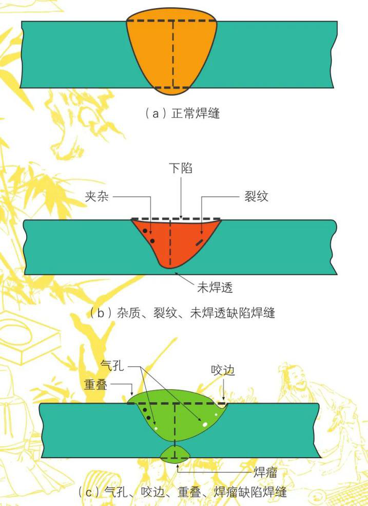 在特定的工作环境中,焊接件存在气孔、裂纹、杂质、咬边等缺陷,很可能会引发严重的安全事故,如有的产品对气密性、是否漏水等有严格要求。正常焊缝、存在缺陷焊缝示意图如图3所示。