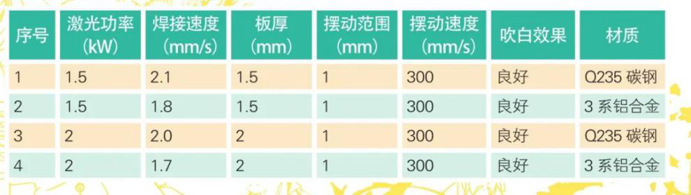 从上述试验数据可以看出,在摆动焊接碳钢板的过程中,随着焊接速度的增加、激光功率也要适当增加,在保证摆动范围不变的情况下,需要增加摆动速度,来保证焊接效果。若是摆动速度过小会出现焊缝不均匀的情况。