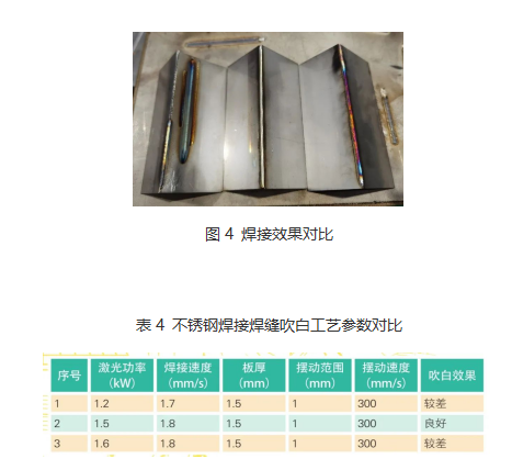 厚度为1.5mm的不锈钢焊接焊缝吹白工艺参数对比见表4,焊接效果如图4所示,3条焊缝(从左到右)焊接参数分别对应表4中的序号1、2、3。