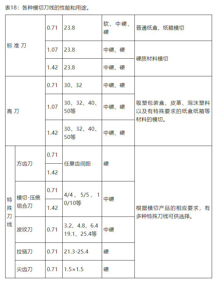模板切割完成后,要根据所模切纸盒相对位置装模切刀和压痕线,为了保证模切质量,首先应选择质量较好的模切刀和压痕线,我们首先介绍一下模切刀,下表所列模切刀系列产品,详细地介绍了各种标准模切刀和特殊模切刀的具体性能和用途。如表18