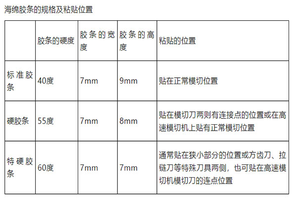 模切版装刀完成后,为了防止模切刀、压痕线在模切、压痕时粘住纸张,使纸张在模切时走纸顺畅,在刀线两侧要粘贴弹性模切胶条。模切自粘胶条在模切中所起的作用非常重要,它直接影响模切的速度与质量。在不同的模切机上,应根据模切的速度和模切活件及有关条件,选用不同硬度、尺寸、形状的模切胶条非常重要。