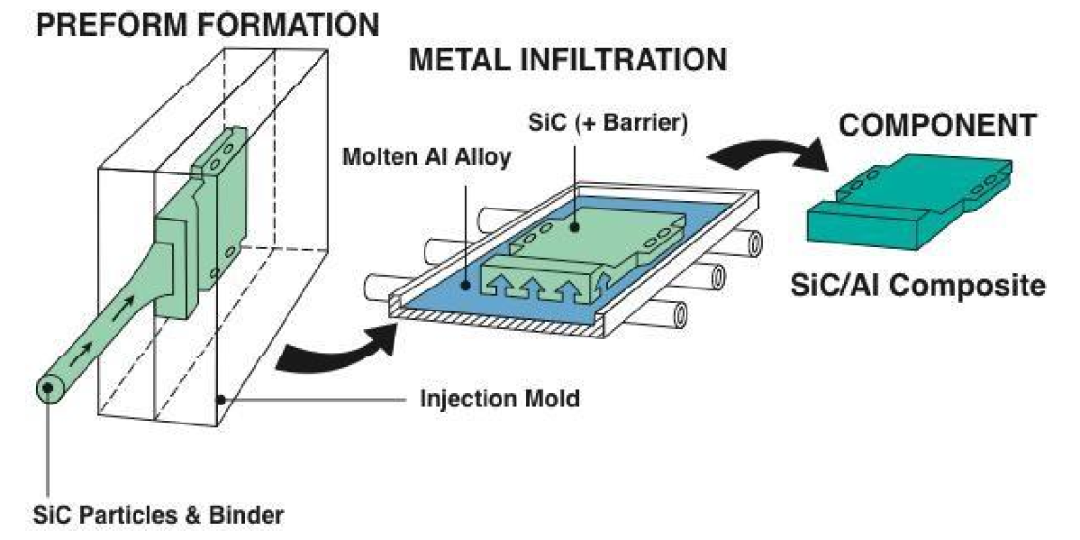 粉末冶金法的优点是Al与SiC成分比例准确,体积分数容易控制;缺点是原材料要求高,生产成本高,产品结构和尺寸受限制。对于SiCp/Al材料而言,Al粉与SiC粉的品质很大程度上决定了最终产品的质量,目前国内的相关制备技术还并不完善。其次,粉末冶金需要首先进行模压成形再送入炉内烧结,为了保证SiCp/Al材料较低的气孔率,烧结过程需要在低压与保护气氛中进行,设备与生产成本较高。同时原材料需要进行近成形模压与烧结,因此在一定程度上限制了薄壁、结构复杂零件的生产。