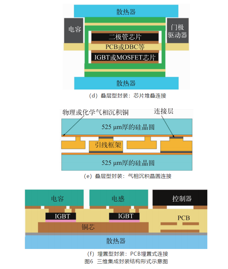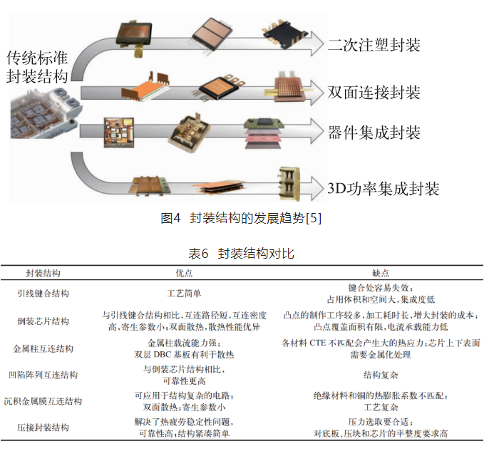 目前功率电子封装结构逐渐从传统的引线键合标准封装结构向二次注塑(Overmold)、双面连接(Double-Side Bonding)、器件集成(Component Integration)、三维功率集成封装结构(3D Power Integration)发展。通过去除引线,可以降低电磁干扰、提高散热效率、增大集成度。其中,注塑结构为紧凑型平面封装,易于批量模块生产;双面连接结构可以实现双面散热,提高散热效率;器件集成结构可以将多种功能集成在模块内部,提高开关速度;三维功率集成结构是将芯片在垂直方向上堆叠连接,可大幅降低寄生电感,提升开关性能。
