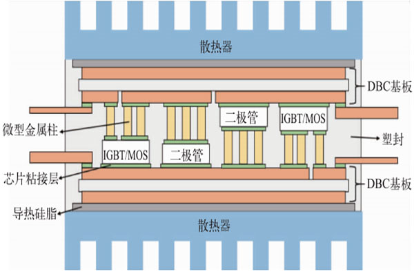 二次注塑封装结构是在传统引线键合的封装结构基础上,将芯片直接粘接在引线框架上,去除了键合引线,并用环氧树脂进行注塑封装的结构。与引线键合的封装结构相比,注塑封装的芯片顶部连接面积增大,使得散热效率提高;寄生电感降低,使得功率损耗降低,并且非常利于模块化批量生产,在电动汽车的整流器中得到广泛应用。