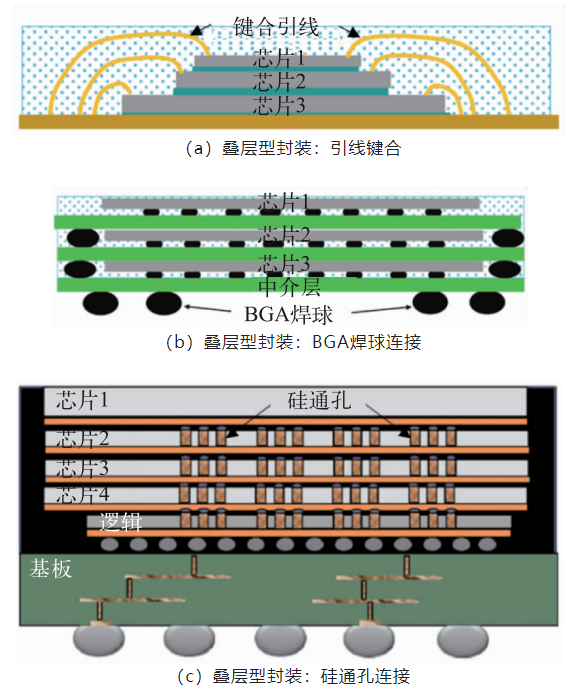 三维集成封装结构形式如图6所示,三维封装结构主要分为叠层型三维封装和埋置型三维封装,是在二维封装的基础上,采用引线键合、倒装芯片、微凸点、球珊阵列(Ball Grid Array,BGA)、硅通孔(Through Silicon Via,TSV)、PCB埋置等工艺技术,在垂直方向上实现多芯片的叠层互连。