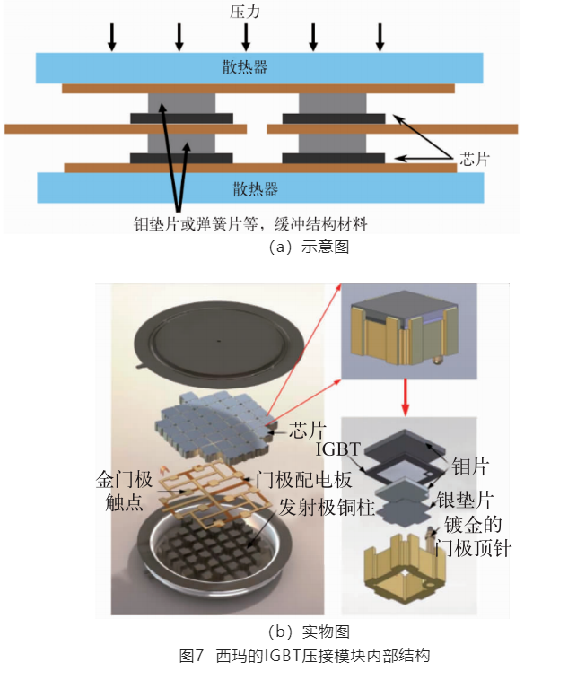除了上述焊接式连接之外,还可以通过压接形成三维封装,典型案例如图7所示,为西码(Westcode)IGBT压接模块内部结构图,各组件由外部施加的机械压力取代引线、钎焊或烧结形成物理连接,结构简单、成本较低、可靠性高,在高压大电流电网中得到了广泛应用。但是在压接模块中,对模块的内部尺寸、各组件的平整度和表面质量要求高,接头的导热和导电性能受压力大小和均匀性的影响很大,需要选择合适的合模压力来保证较小的接触电阻和接触热阻,但会不可避免地受到表面粗糙度和结构变形的影响。在压接结构中常引入CTE较小的弹性缓冲结构和材料,如Mo或Be垫片、弹簧片等,来均匀压力、降低热-机械应力,提高可靠性。