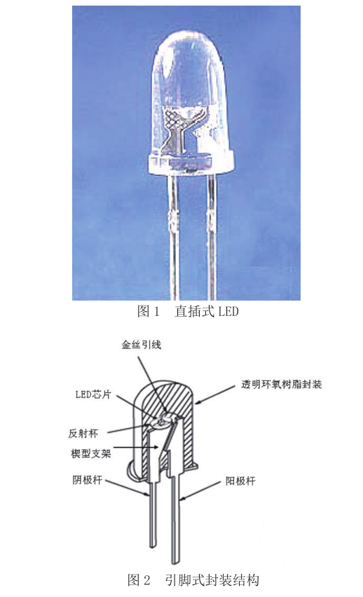 LED 的封装形式多种多样,图 1 为直插式 LED 封装形式。本文将以直插式红光 LED 为例介绍 LED 的封装流程。直插式 LED封装又称 Lamp-LED 封装 ,引脚式封装。引脚式封装采用引线架作为各种封装外型 ,如直径为 5 mm 的圆柱型(简称 Φ5)封装的引脚,图 2 为引脚式封装结构。