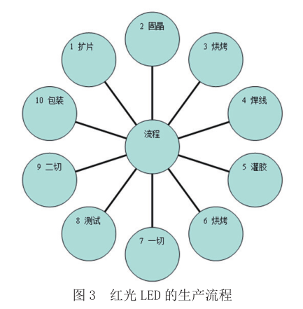 图 3 为红光 LED 的生产流程 ,依次是扩片、固晶、烘烤、焊线、灌胶、烘烤、一切、测试、二切和包装。其中主要的工序是固晶、焊线、灌胶和测试