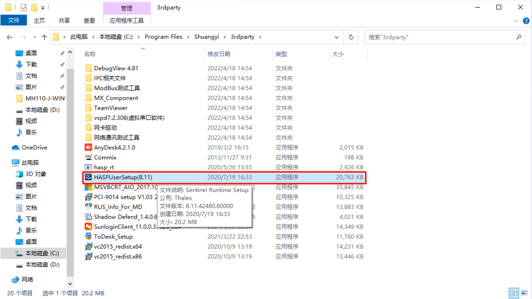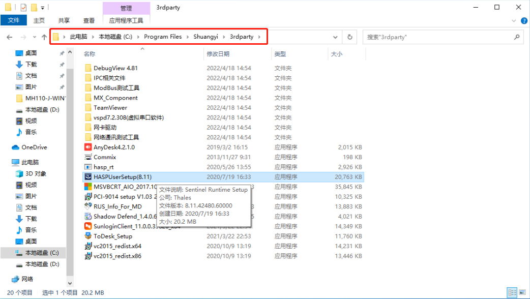 2. 通过“此电脑-本地磁盘C-Program Files-Shuangyi-3rdparty”路径,找到“HASPUserSetup(8.11)”文件