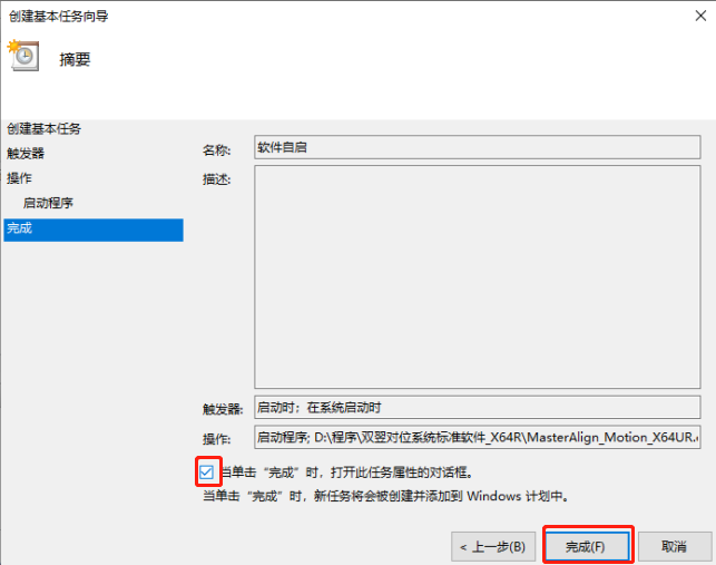 Step7:完成任务计划的设定,勾选“单完成时打开此任务属性的对话框”;