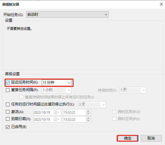 Step10:确定,完成触发器延迟时间的设置,每次开机时,系统将延迟对应的时间后启动选定的程序;(注意:程序的路径和名称不能更改,如果更改后,需要重新设定)