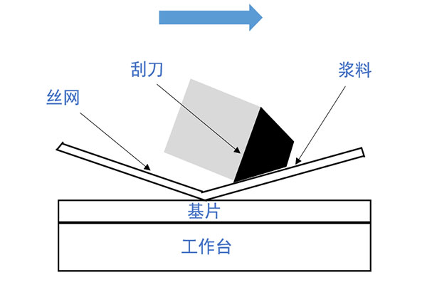 丝网印刷是利用丝网图案部分网孔透浆料,非图案部分网孔不透浆料的基本原理进行印刷的一种技术。具体原理为:印刷时在丝网一端倒入浆料,用刮刀在丝网的浆料部位施加一定压力,同时朝丝网另一端移动,从而使浆料在移动中被刮板从图形部分的网孔中挤压到基片上,如图1所示。