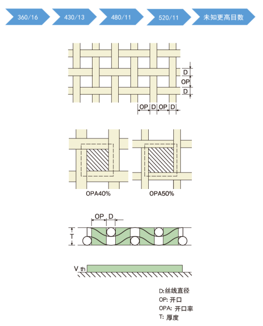 网纱目数为1英寸*1英寸的网纱内含有的网目数量。目数一般可以说明丝网的丝与丝之间的疏密程度。目数越高丝网越密,网孔越小;反之,目数越低丝网越稀疏,网孔越大。网孔越小,浆料通过性越差,网孔越大,浆料通过性就越好。由于电池印刷环节中对浆料线宽的要求越来越高,因此,目前常规网版都有朝高目数发展的趋势