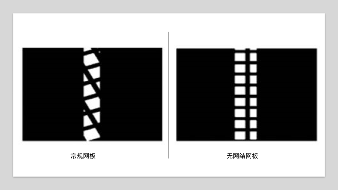 所以网版设计未来趋势为:目数越来越高,线径越来越细,线宽越来越窄。但常规网版由于网结的存在,印刷线型均匀性差,势必会影响超细线印刷和副栅线开口进一步变窄的趋势,因此无网结网版的市场需求应运而生。