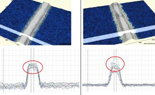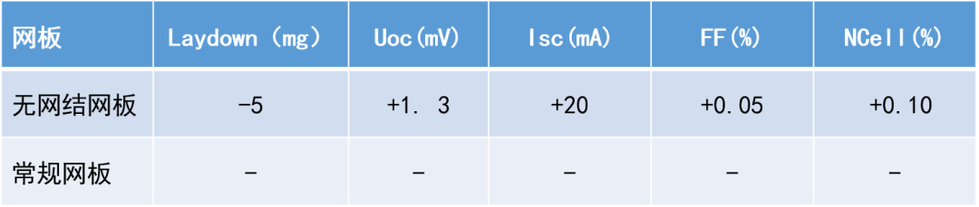 无网结网版印刷后高宽比,线型明显优于常规网版(如图6所示),通过高宽比提升以及线型优化,电池片短路电流,开压,填充均能得到较大提升,从而显著提升效率,同时线宽的缩窄可显著降低单耗,具体数据如下:
