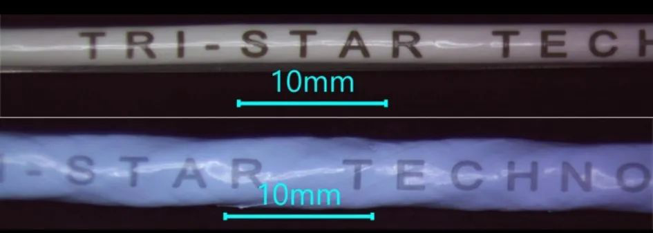 图2. ETFE(顶部)和PTFE(底部)电线上的紫外激光打标