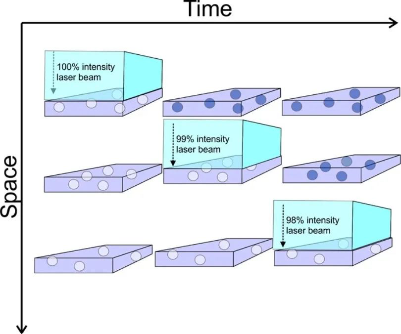 图4说明了空间和时间的过程。入射激光束自由穿透第一层材料层,在与原始白色TiO2颗粒相互作用时损失其总能量的一小部分(例如,1%),将它们变成黑色。同样的事情发生在第二层,依此类推,直到大部分激光脉冲能量在顶部50-100层内被吸收。实际上,该过程在时间和空间上都非常有限,因为总脉冲持续时间通常低于30ns,标记深度不超过50um左右。
