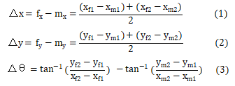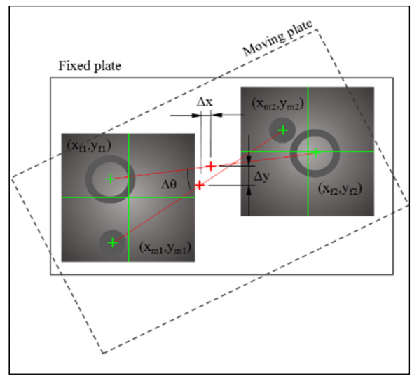 影像几何对位方法为目前最常用的对位方法,原理是利用已知的靶标几何寻找对位的中心,藉由像素与实际单位的转换可找出实际坐标与影像坐标之间的转换,便可由影像误差计算出偏移量(Δx,Δy),由于大部分的图形为对称设计,因此常常需要多个靶标来进行角度(Δθ)的偏移计算,如图1所示