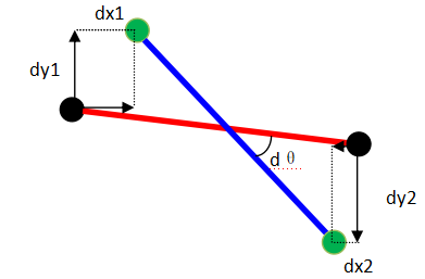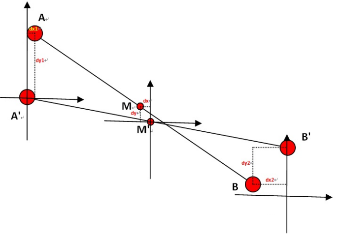 如图2所示,目标点位A和B,目标间的中点设为M;对象点为A'和B’,对象点的中点为M'。以对象间的中点M'为轴进行旋转,使对象A'B'和目标线AB平行的角度即为dθ。朝X方向和Y方向平行移动,在到达一致之前的距离为dx和dy。