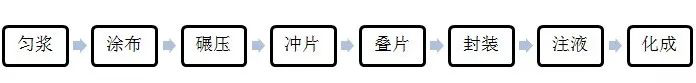 锂离子电池生产过程较为复杂,以万向一二三为例,主要包括:匀浆、涂布、碾压、冲片、叠片、封装、注液、化成几个工序。如下图所示。