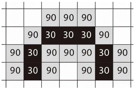 眼睛中央部分较黑,周围较淡,因此中央部分的数值是 “30”,周围部分的数值是 “90”。