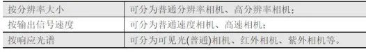 工业相机按照芯片类型、传感器结构特性、扫描方式、分辨率大小、输出信号方式、输出色彩、输出信号速度、响应频率范围等有着不同的分类方法。